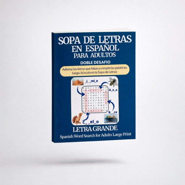 • Desafío Doble: A diferencia de otros libros de sopa de letras, nuestro libro ofrece un reto adicional: los lectores deben descubrir primero cuales letras faltan para completar la palabra oculta que necesitan buscar en la Sopa de Letras, lo que añade una capa extra de diversión y desafío mental.