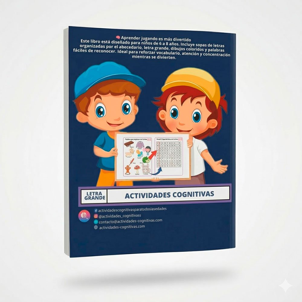 Un libro de sopas de letras a full color para niños de 6 a 8 años. Incluye el abecedario completo, ilustraciones hermosas y actividades diseñadas para reforzar vocabulario, concentración y aprendizaje mientras juegan. ¡Diversión y educación en cada página!